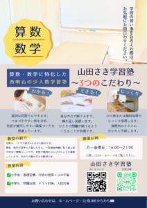 山田さき学習塾では、小学生も中学生も一人ひとりの苦手に合わせて復習に取り組んでいます。場合によっては学年をさかのぼり、基礎からやり直すこともあります。